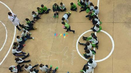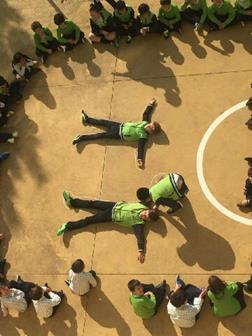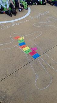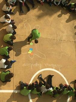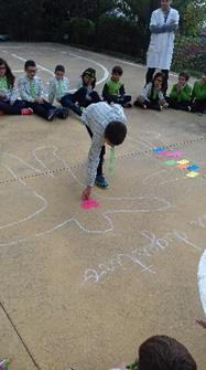 Para dar início a esta aula, foi pedido a dois voluntários, para se deitarem no chão, para que fossem desenhados os seus corpos. De seguida, os professores das respectivas turmas distribuíram vários cartões com o nome dos órgãos destes sistema, de forma a que os alunos colocassem os mesmos no local correto.