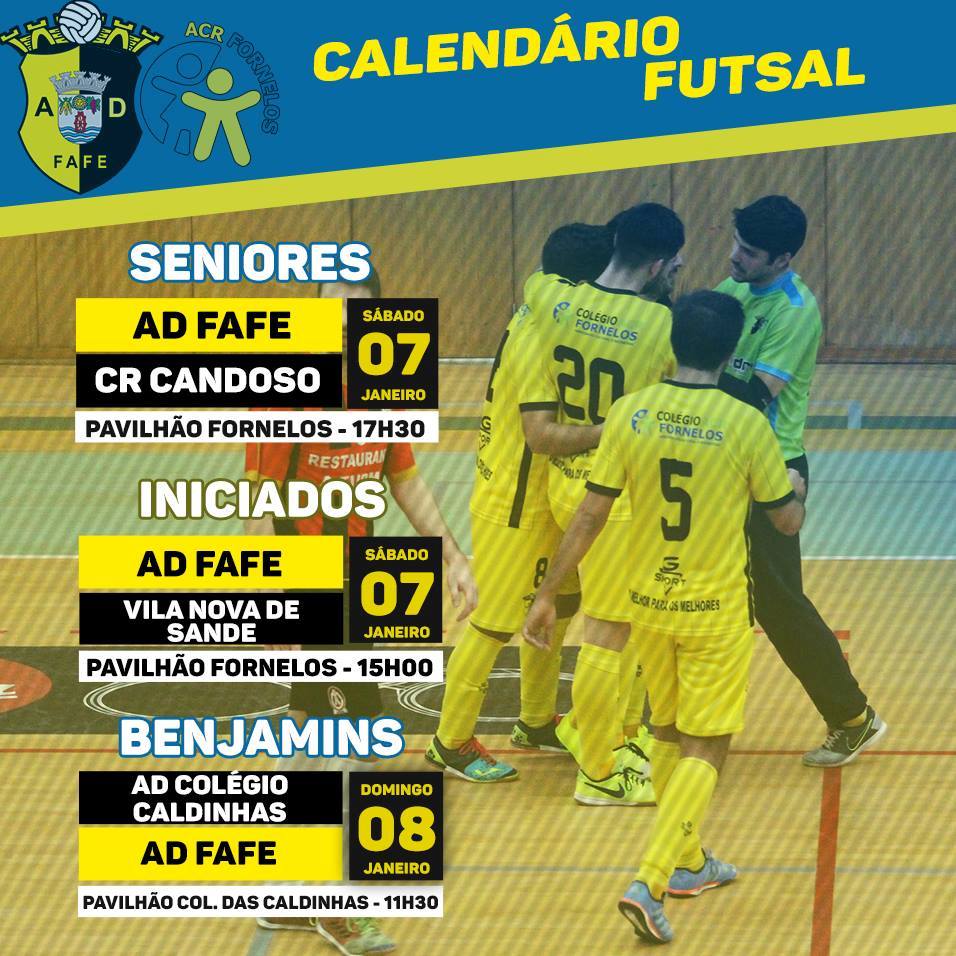 Futsal CALENDÁRIO FUTSAL – PRÓXIMO FIM DE SEMANA : admin — Janeiro 3, 2017 Confira as datas e horários dos jogos das equipas Sénior e Formação da AD Fafe/ACR Fornelos para que possam marcar presença e apoiar !