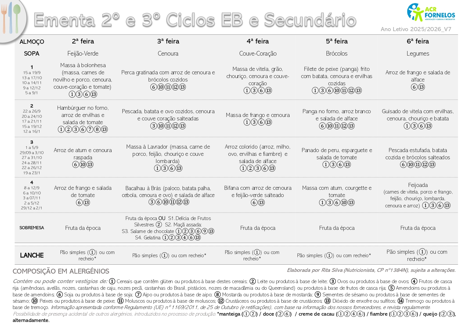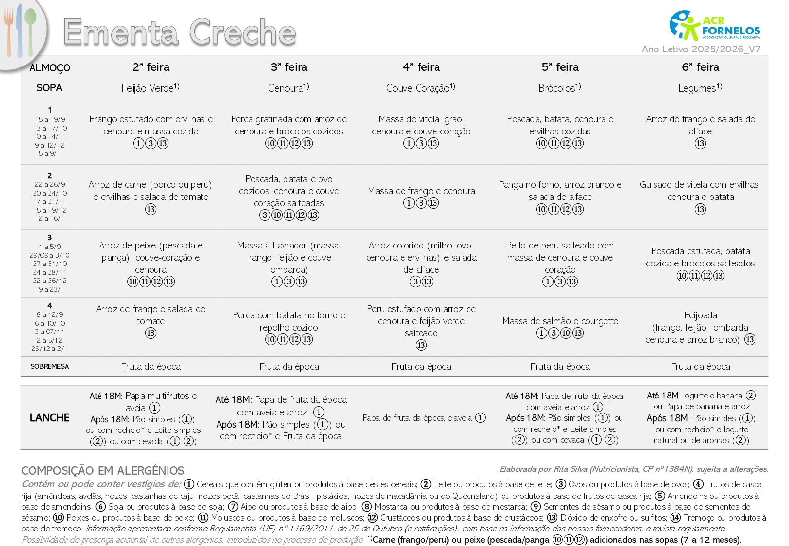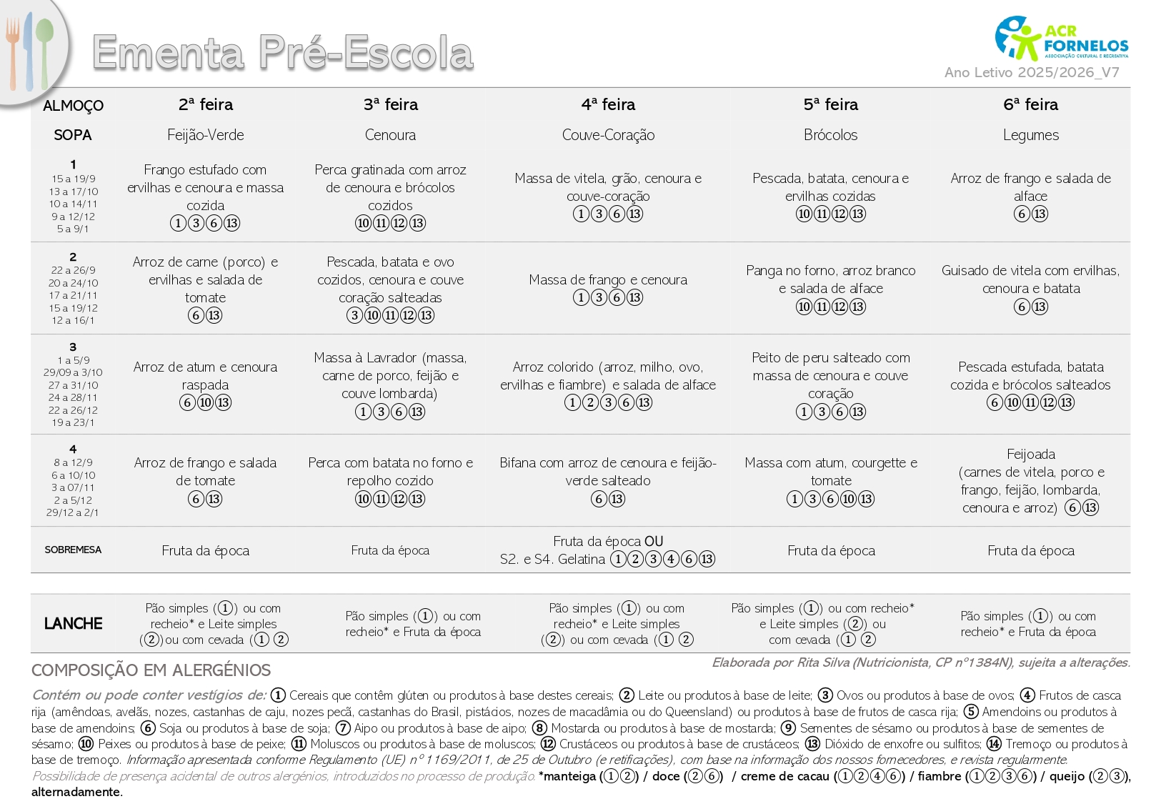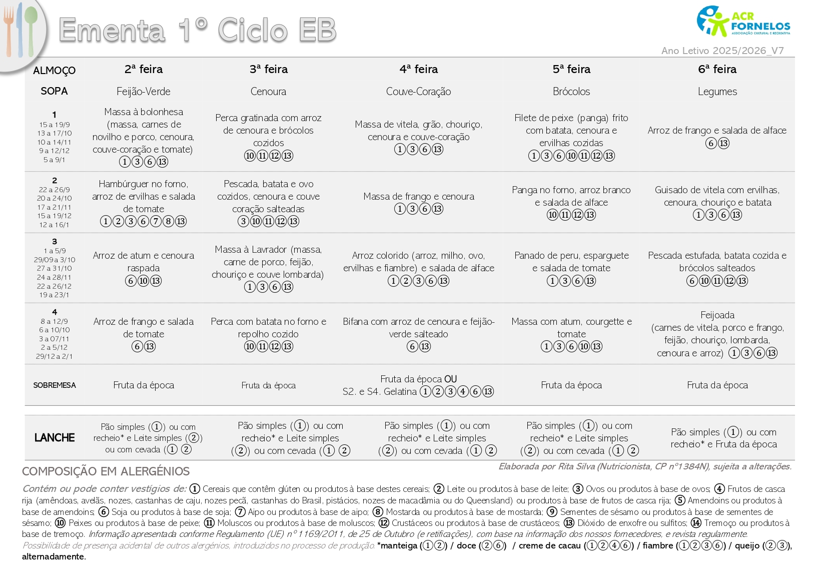 *Ementa para o 1º período do ano letivo 2025-2026, atualizada pela Dr.ª Rita Silva, Nutricionista da ACR Fornelos.